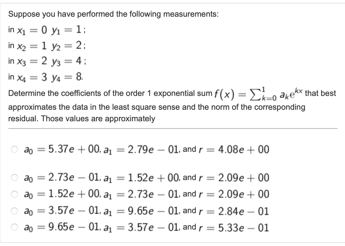 res=norm(p-y)Correct answer is a_0 = 9.65e-01, a_1 = 3.57e-01, and r = 5.33e-01, in this case, E.