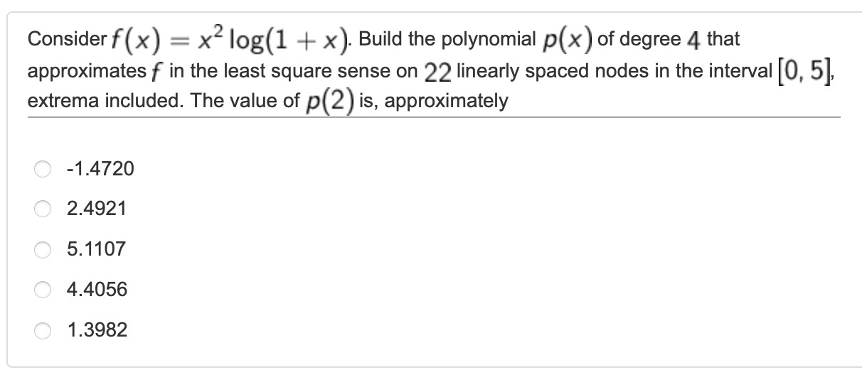 We are asked to approximate the function f(x) = x^2*log(1+x) using a polynomial p(x) of degree 4. We need to build the polynomial p(x) by fitting it to 22 nodes in the interval [0, 5]. The question specifically asks us to find the approximate value of p(2), which is the value of the polynomial at x = 2.