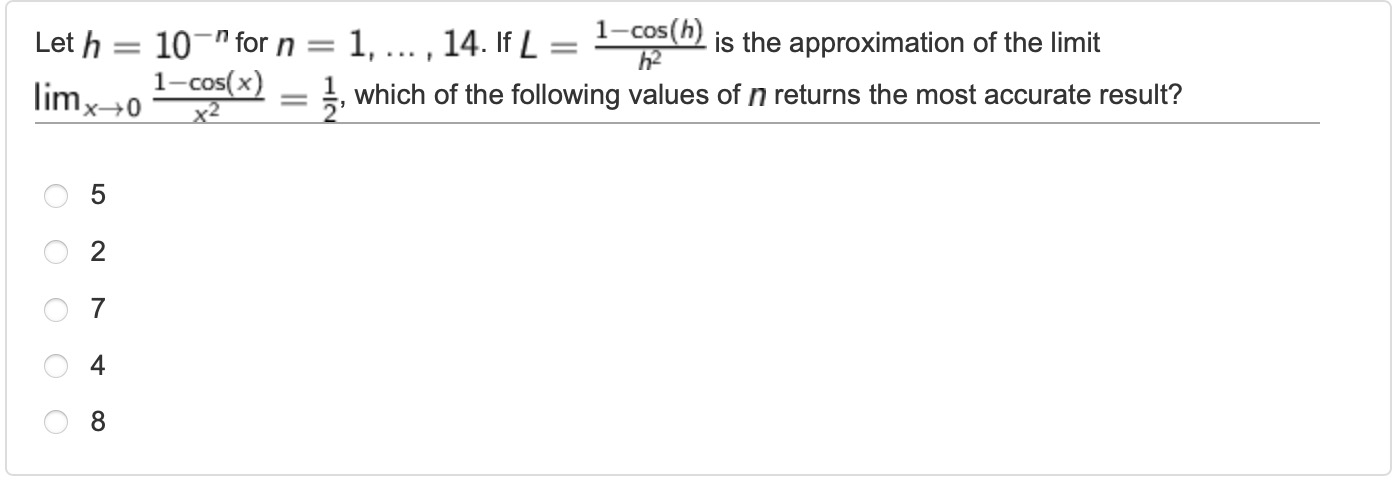 The question is asking us to approximate the limit of a function as it approaches zero. We are given a formula, L, which approximates the limit, and we need to determine the value of n that provides the most accurate result. Basically question asks us in which n value, error is the lowest.