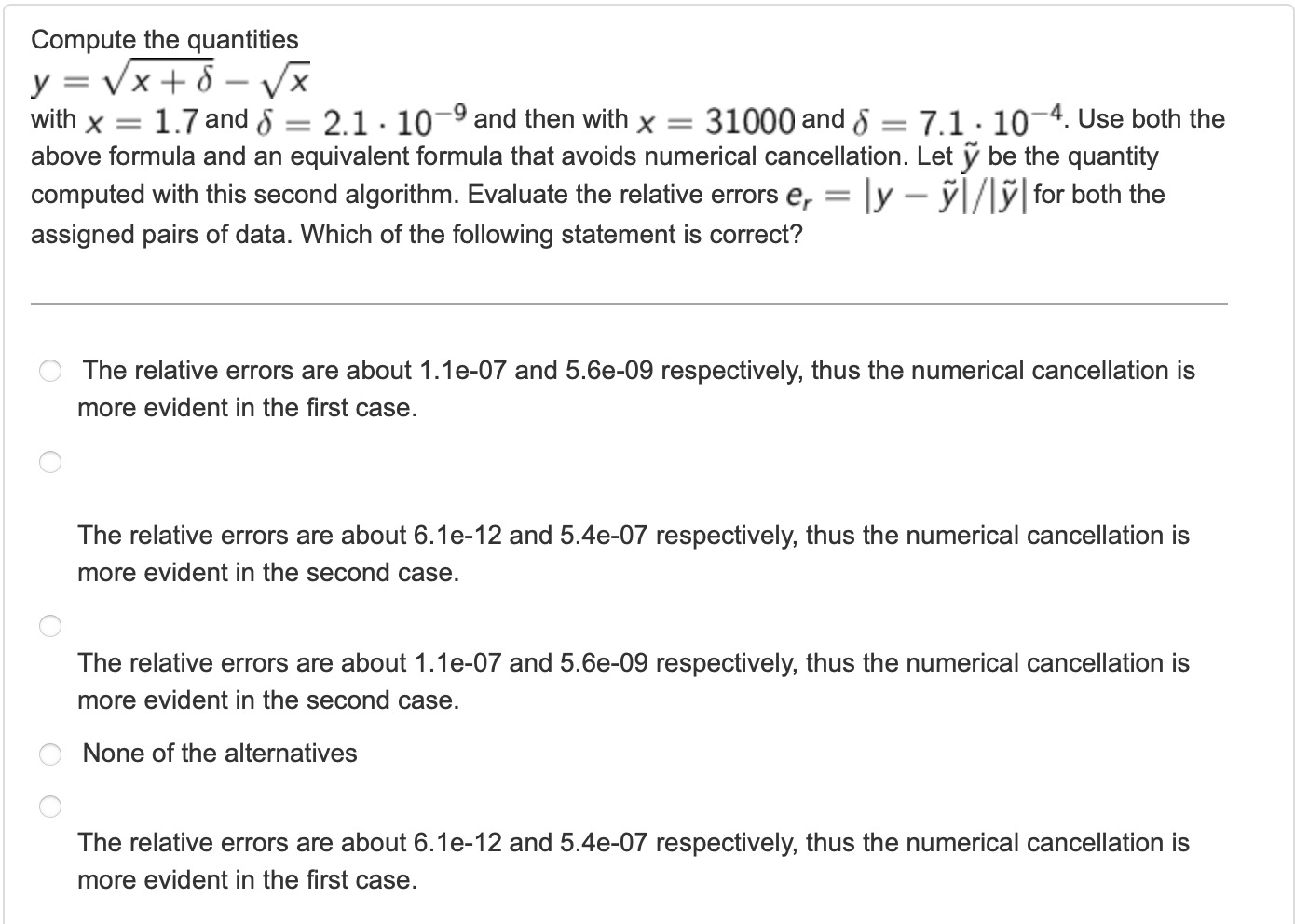 The question asks us to compute the quantities y using two different formulas for two sets of data. One formula involves directly subtracting square roots, while the other avoids numerical cancellation. We need to evaluate the relative errors between the results obtained from the two formulas for each set of data.