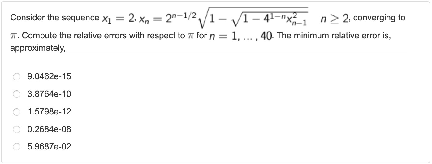 The question asks us to compute the relative errors with respect to π for a given sequence. We need to calculate the values of the sequence for n = 1 to 40 and compare them to the value of π, computing the relative error for each iteration. Finally, we find the minimum relative error among these calculations.