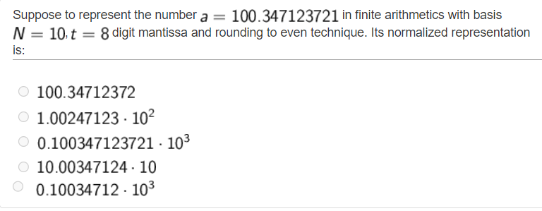 This question asks us to represent the number a with base N=10, t=8 digit after 0, and rounding even tecnique which means at the end we need to round the closest even number.